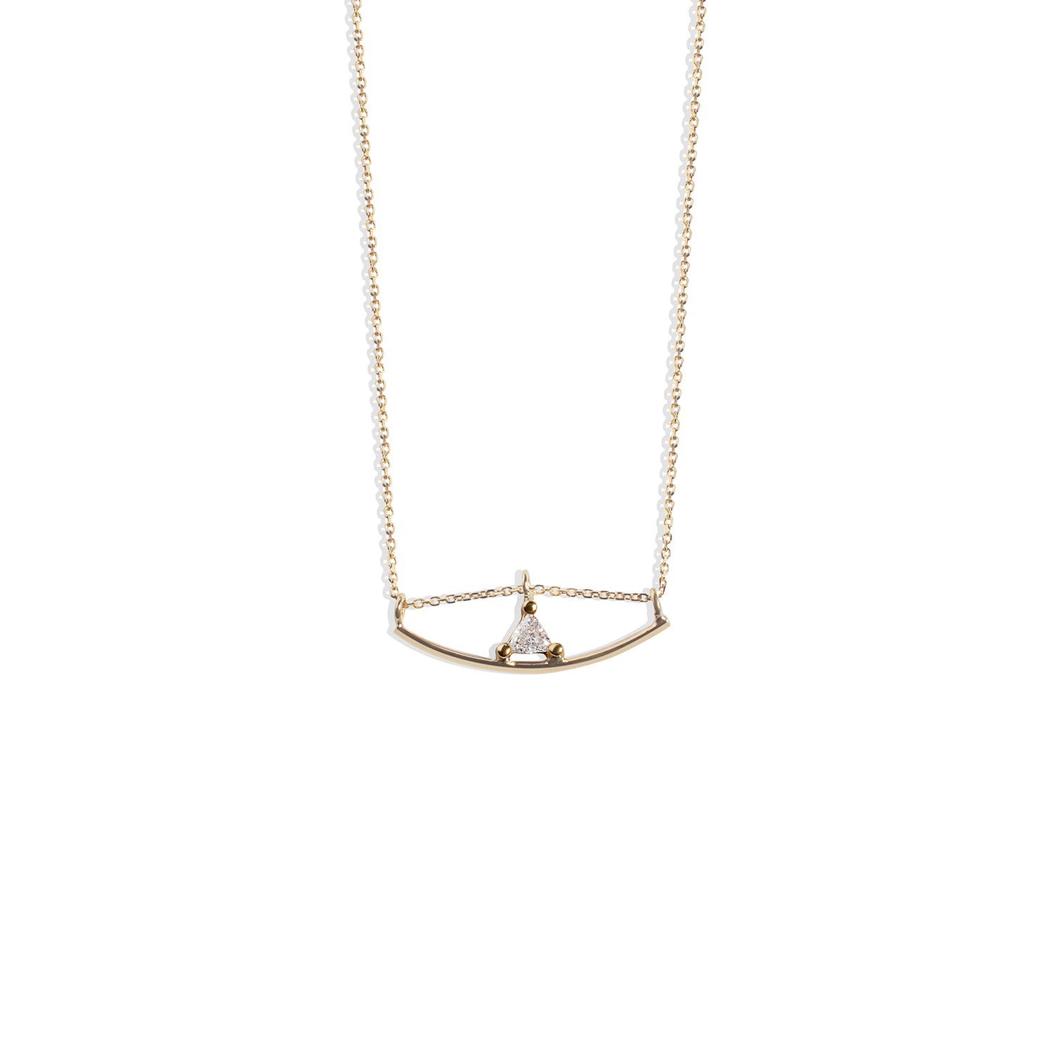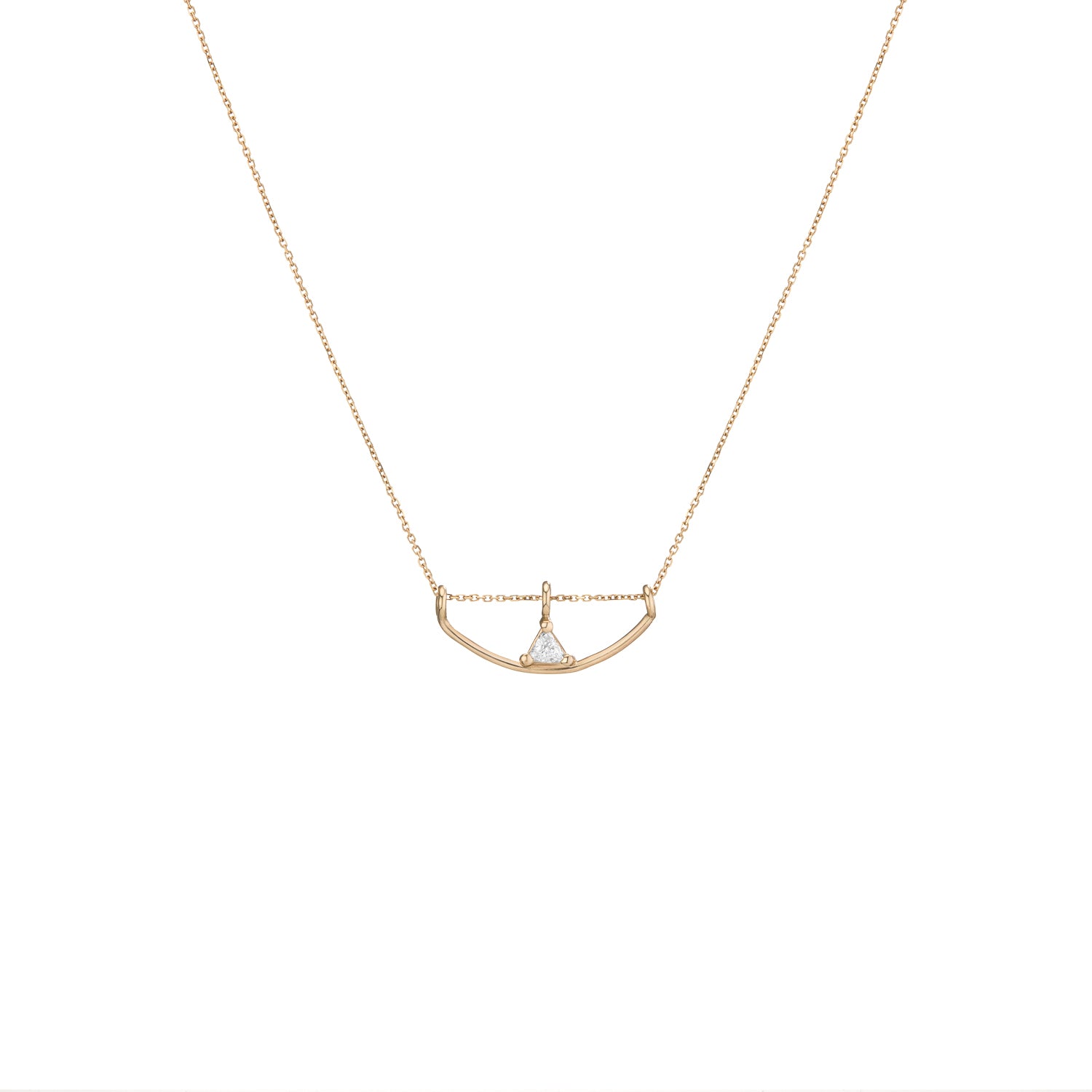 The Element Diamond Gold Necklace is a delicate piece comprised of a curve with a triangle shape gem. The chain threads through the set gem to create an intricate finish to this style.