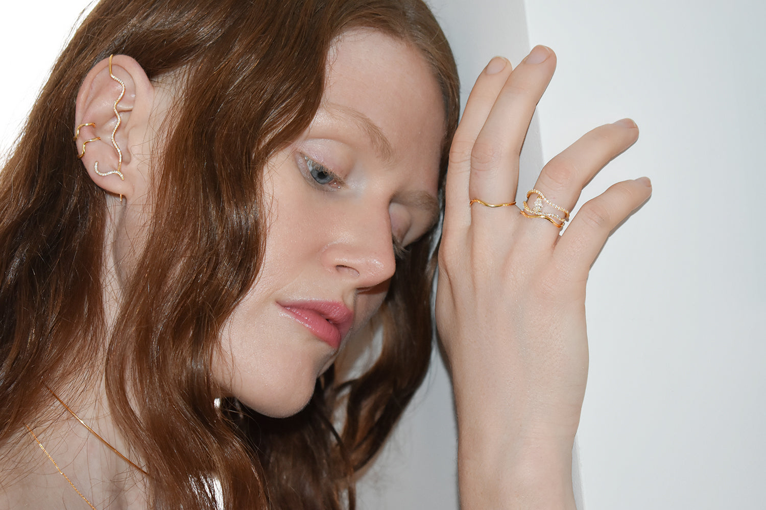 Inspired by traditional tribal earrings that feature exposed piercing elements, LABULGARA founder Nadia Todorova transformed a raw gold wire into a refined, sculptural statement. The result is a minimalist yet powerful form that blurs the line between jewelry and wearable art.