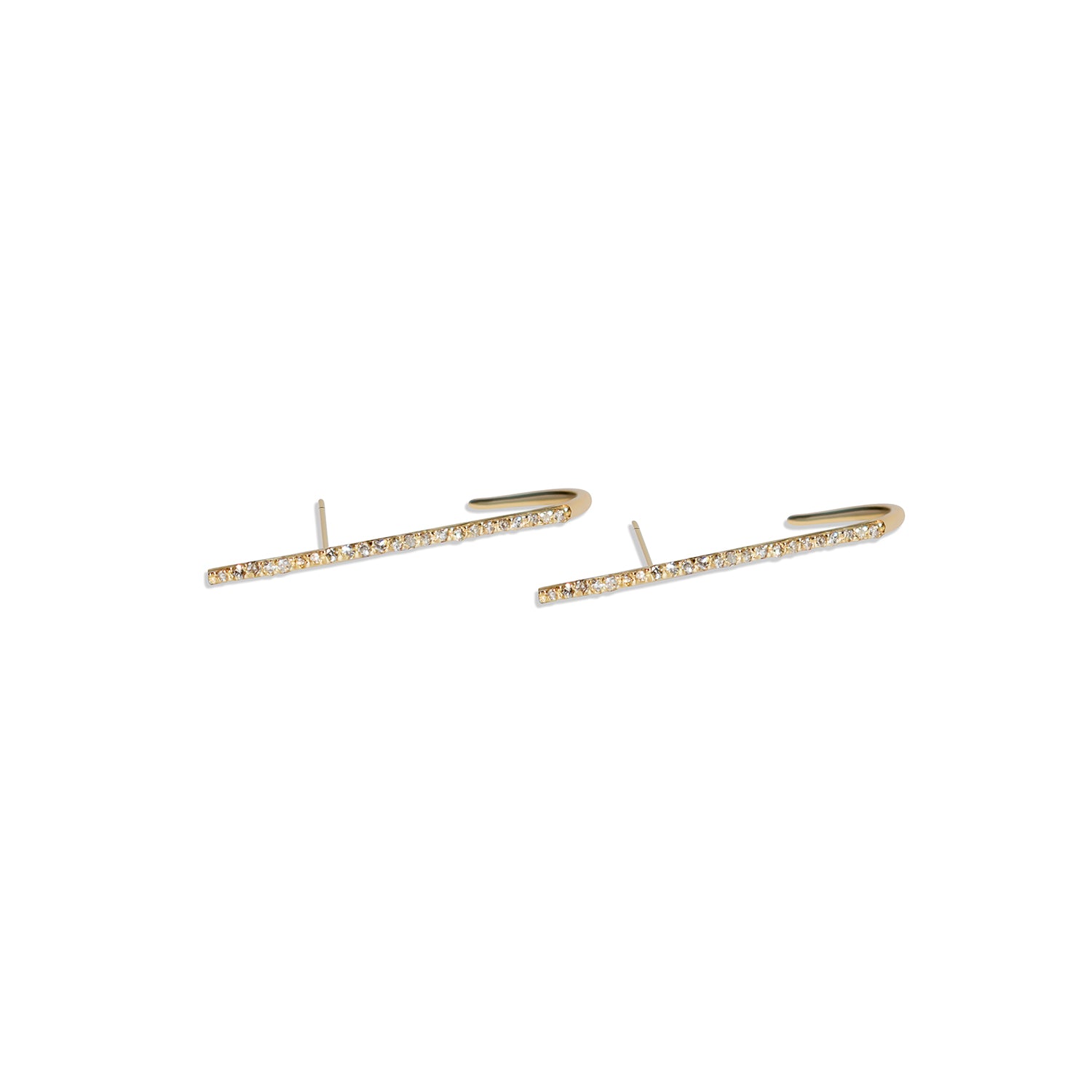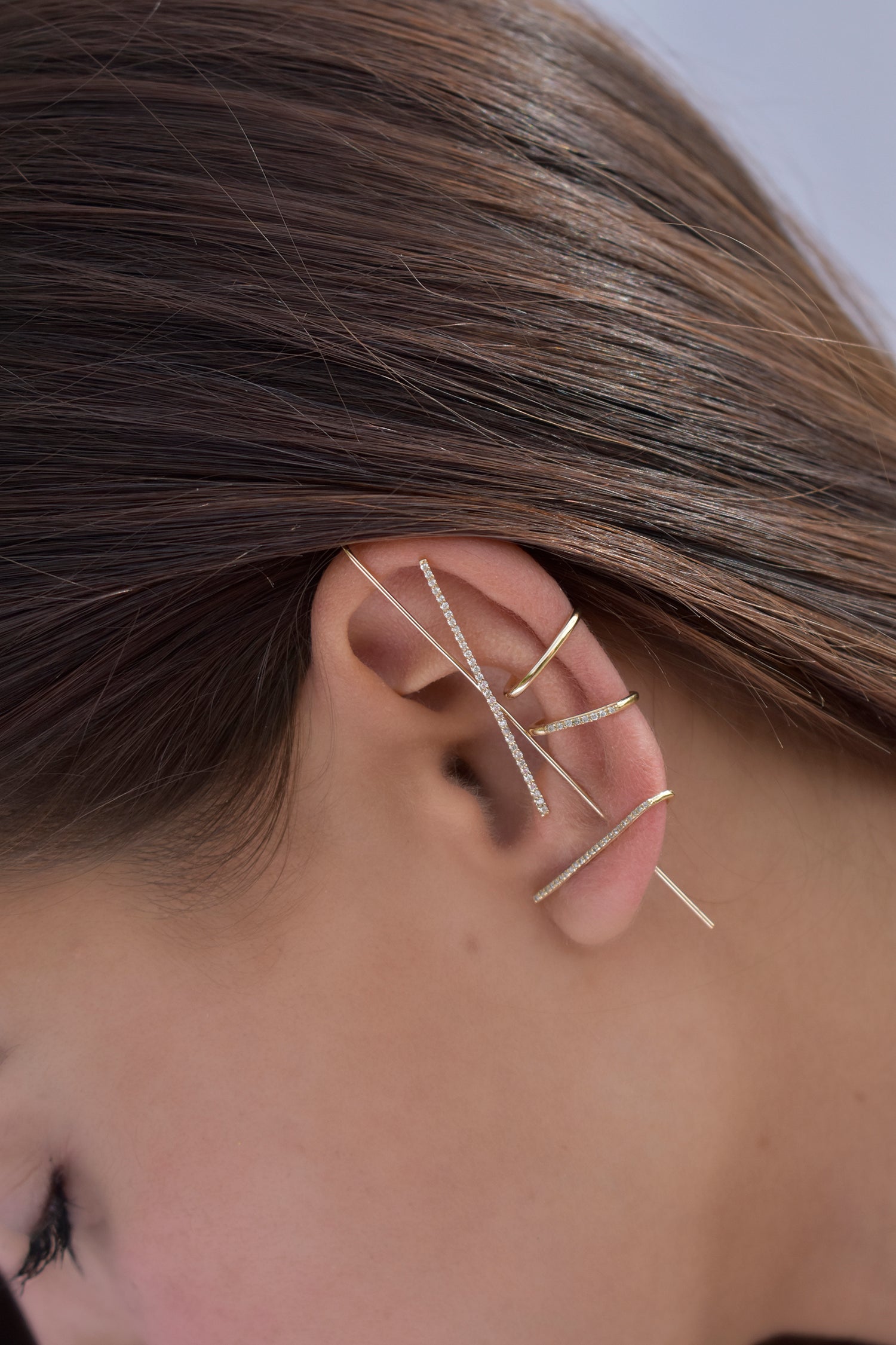 The Diamond Crusader Earlobe Line Cuff is a contemporary earring with unexpected silhouette. This style crosses the middle of your earlobe from one side to the other. It could be worn down as a long bar stud as well.