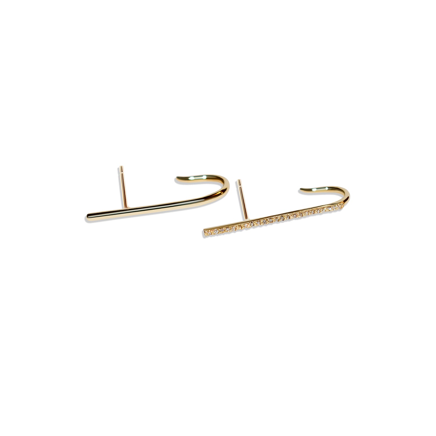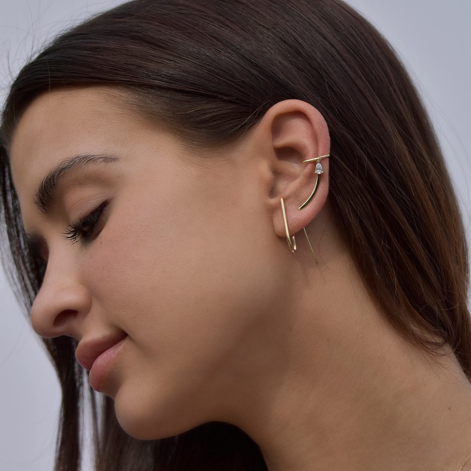 The Solid Crusader Earlobe Line Cuff is a contemporary earring with unexpected silhouette. This style crosses the middle of your earlobe from one side to the other. It could be worn down as a long bar stud as well.