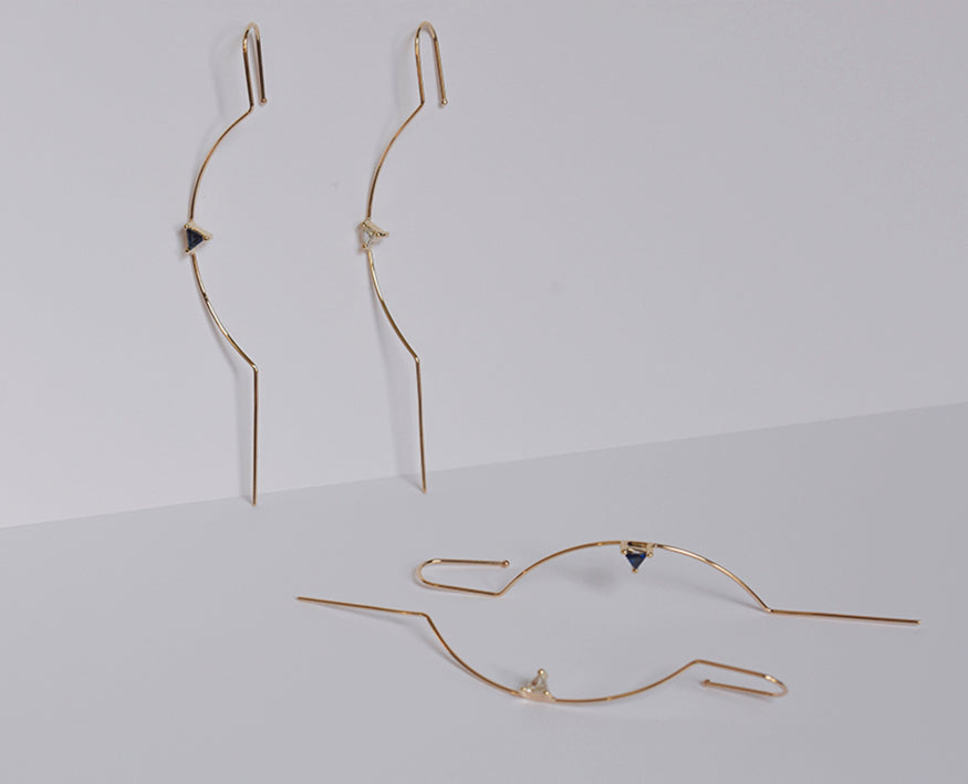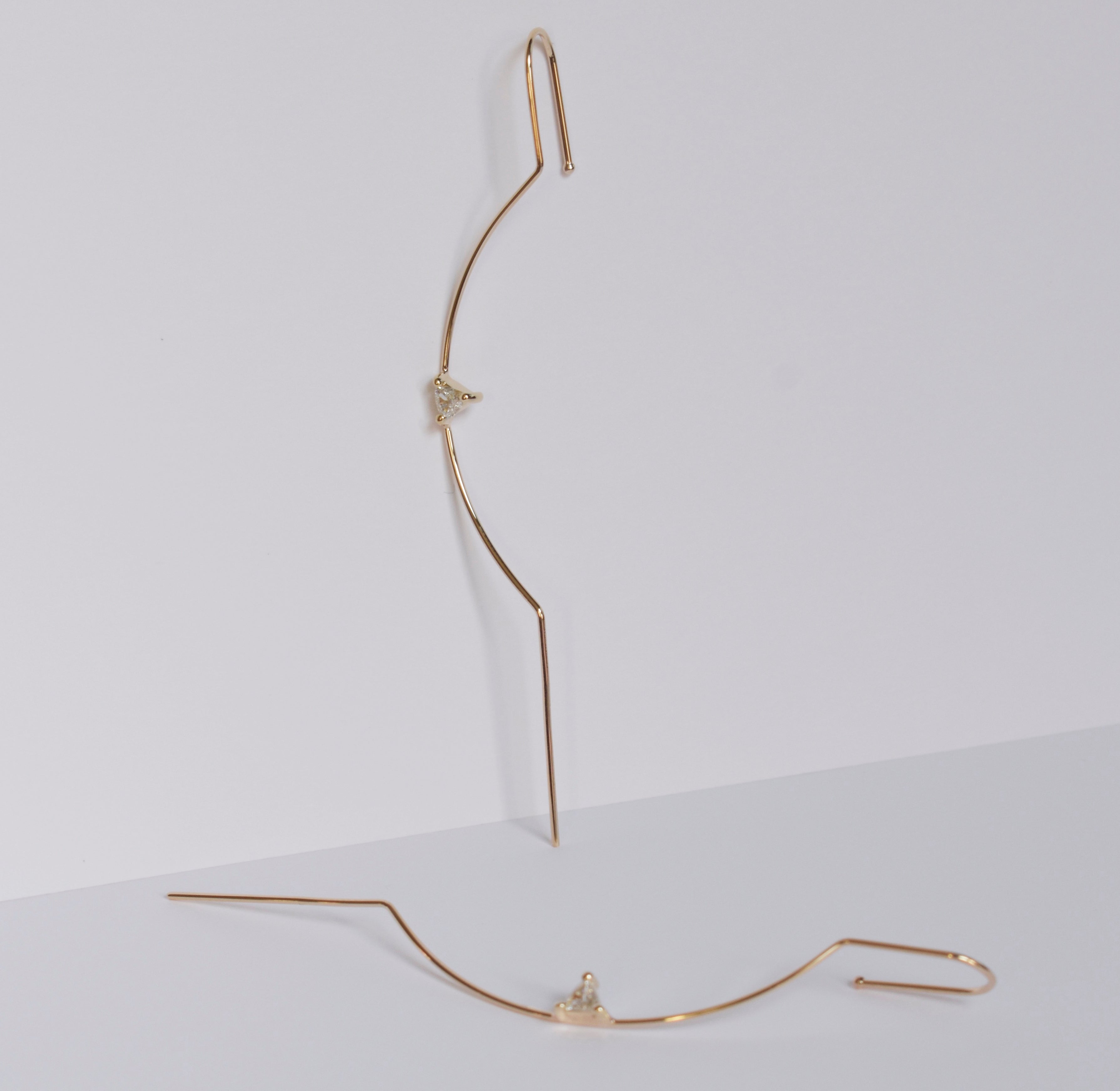 The Element Needle Earring is comprised of an arch intersect with a triangle gem. The earring fallows the curves of the ear and creates an edgy, opulent statement look.