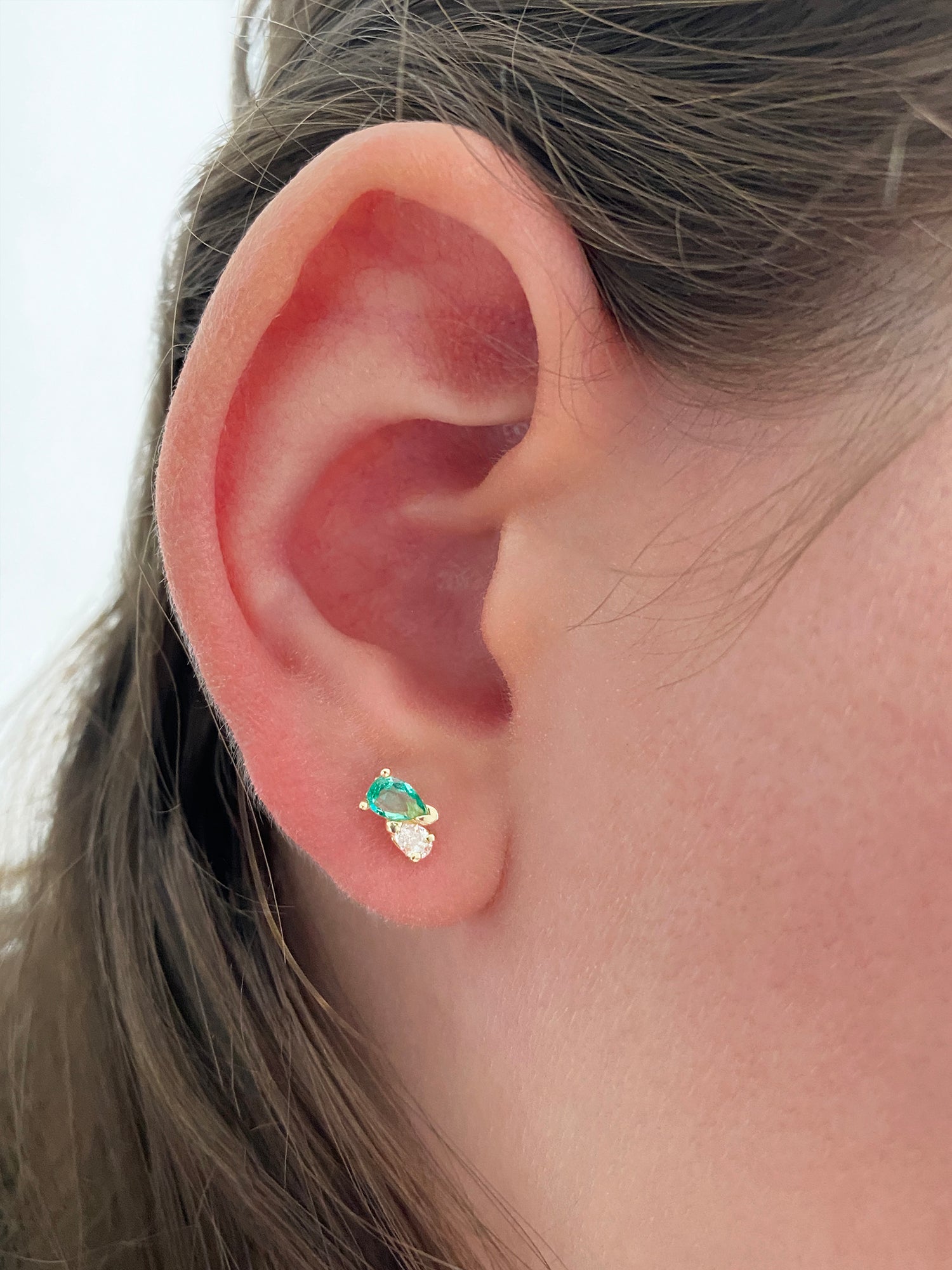 Me and You Gold and Emerald Stud Earring is crafted with two exquisite pear-shaped precious stones nestled in lustrous 14k gold. This effortless design exudes sophistication and can be effortlessly worn every day.