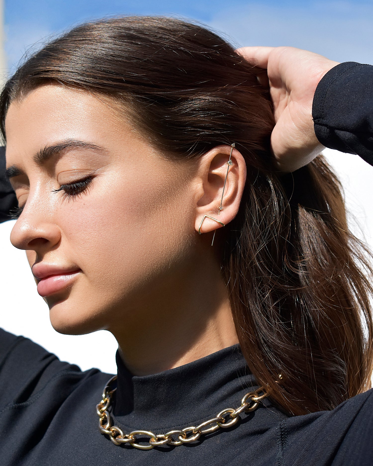 Thread the hook end through your ear lobe piercing and let the hook part to cradle the top of the ear.