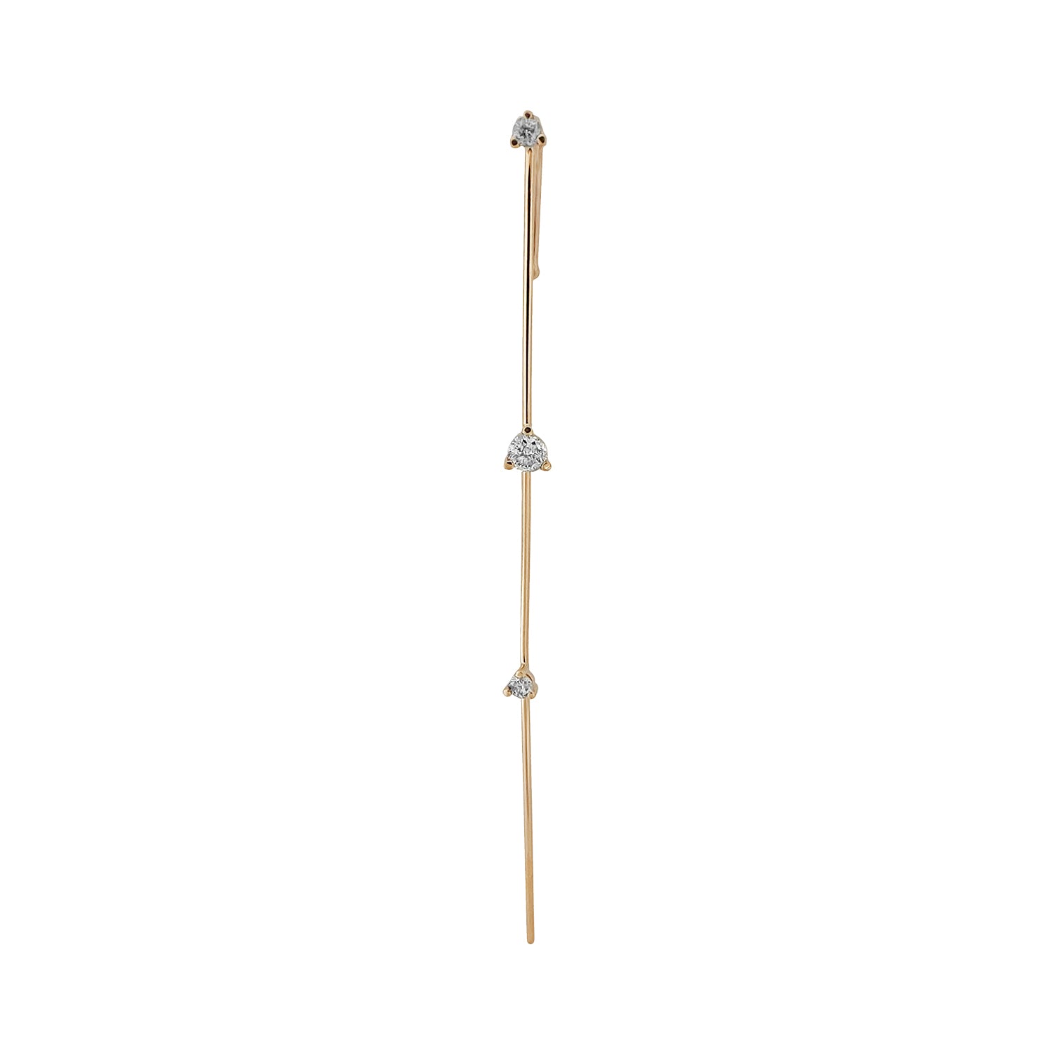 The Rain drops Needle Earring is comprised of a delicate gold needle like rod featuring three round shape diamonds in various sizes.