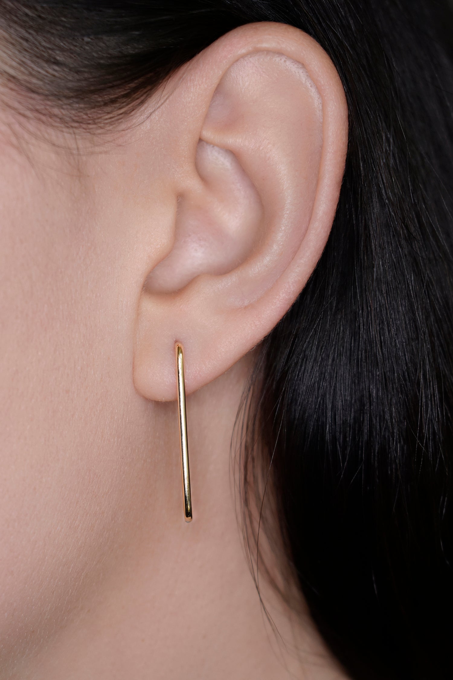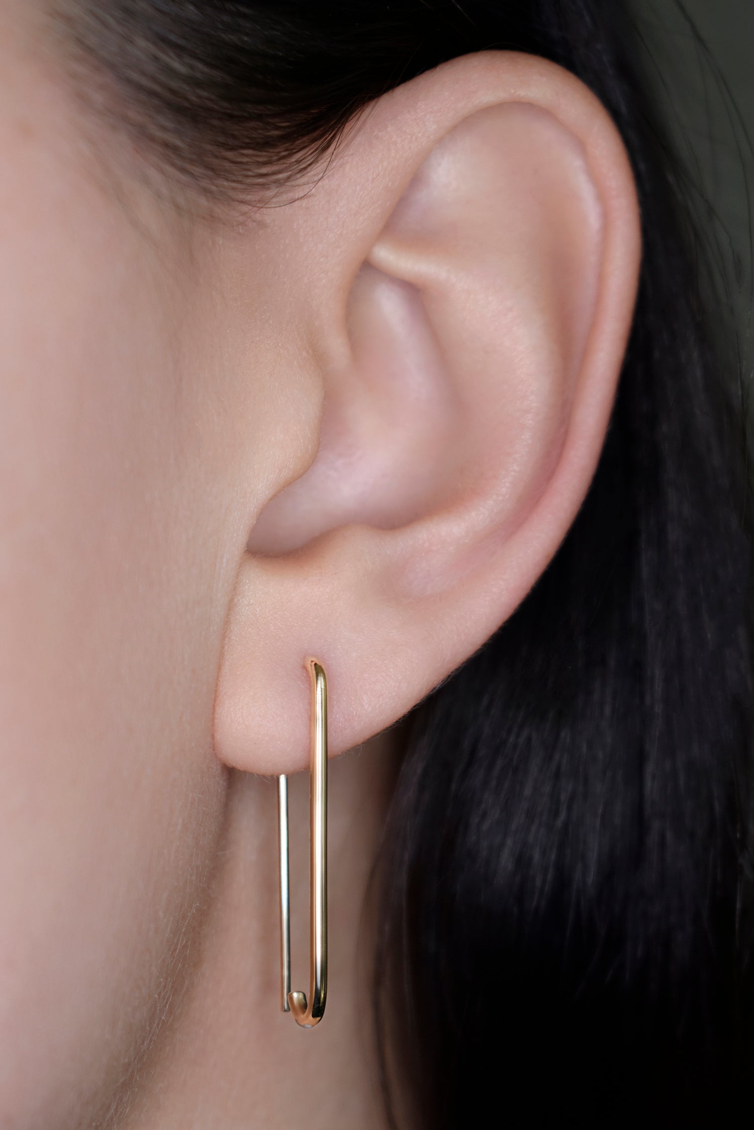 The Paperclip Earring is an everyday favorite piece featuring a thick solid gold face. This style offers an edgy look that differs from your regular hoop. The Paperclip earring can be worn solo or added to any ear stack.