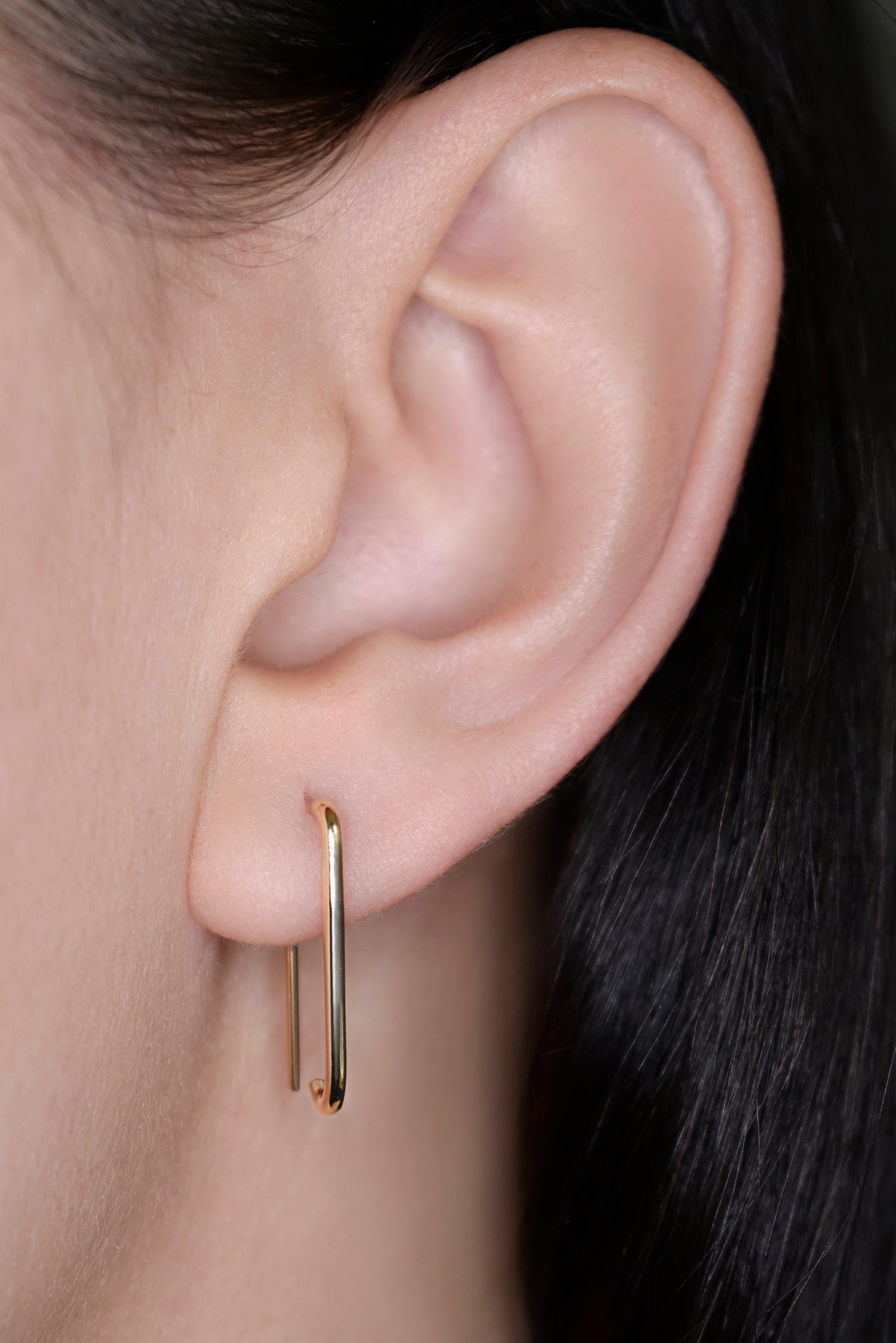 The Paperclip Earring is an everyday favorite piece featuring a thick solid gold face. This style offers an edgy look that differs from your regular hoop. The Paperclip earring can be worn solo or added to any ear stack.