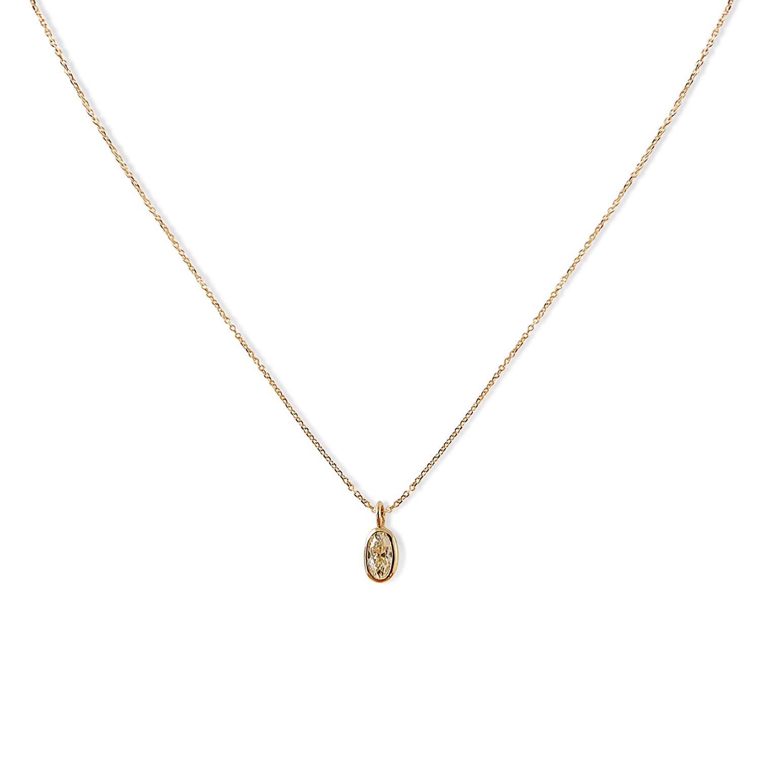 The Beach Pebble Gold Necklace is comprised of an oval gem set in a bezel setting and hung from a delicate gold necklace.