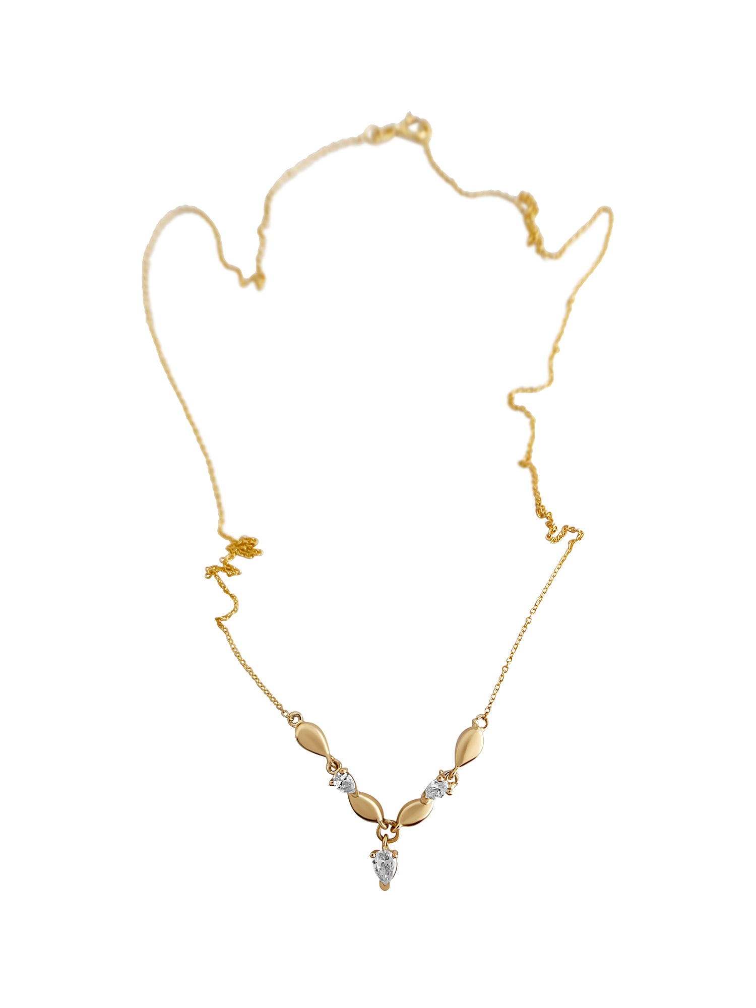 Embrace the essence of elegance with the Cascade Water Diamond and Gold Necklace, a masterpiece of fluid design and sparkling brilliance. Crafted in luxurious yellow gold, this necklace features a delicate arrangement of smooth gold droplets that flow seamlessly into three dazzling diamonds, culminating in a breathtaking pear-cut diamond drop.