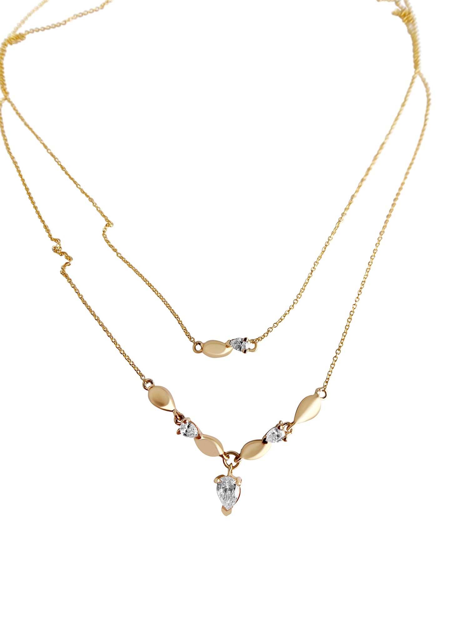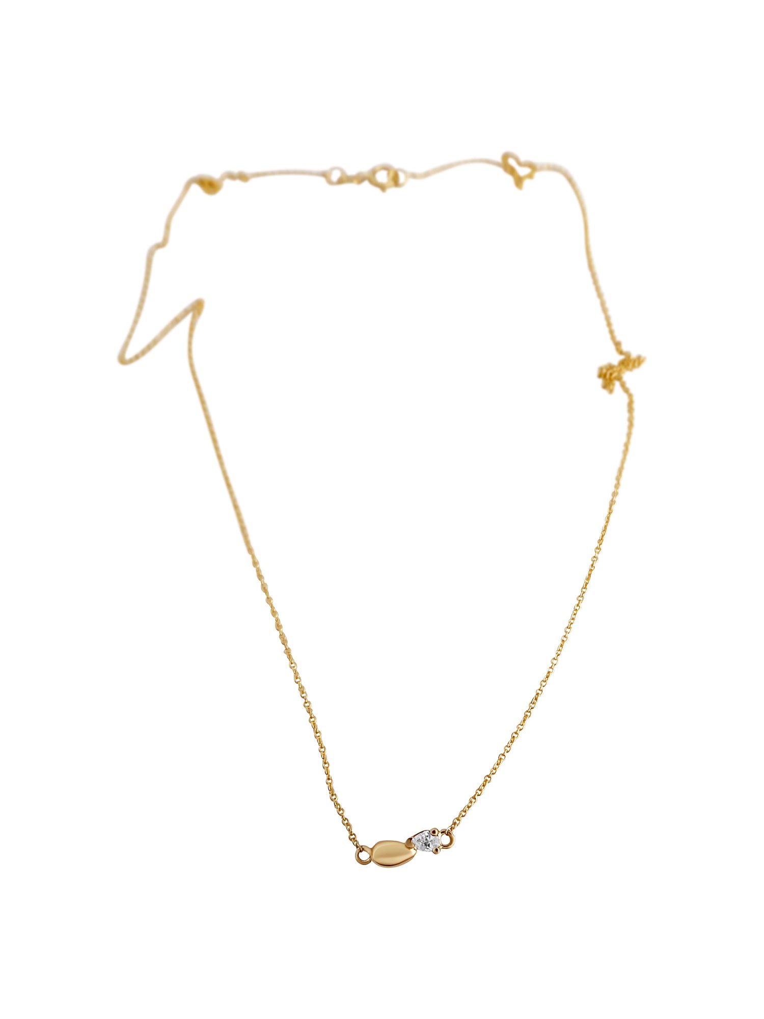Discover the perfect blend of modern sophistication and classic charm with this exquisite Dewdrop Diamond and Gold Necklace. The necklace features a brilliant round diamond, securely set in a three-prong setting, shimmering with unmatched brilliance and a sleek pear-shaped gold accent that adds a touch of warmth and refinement, creating a beautifully balanced design.