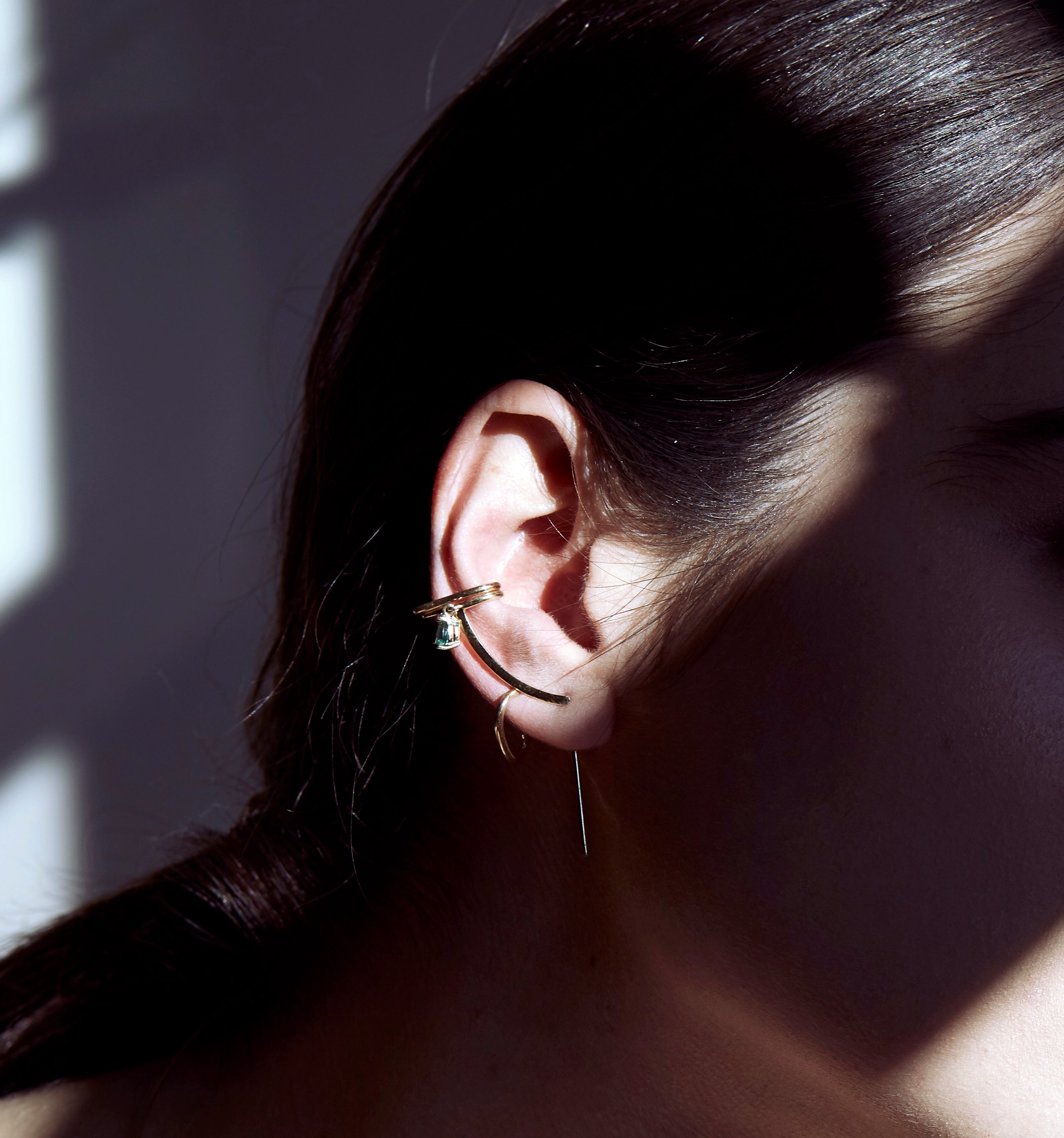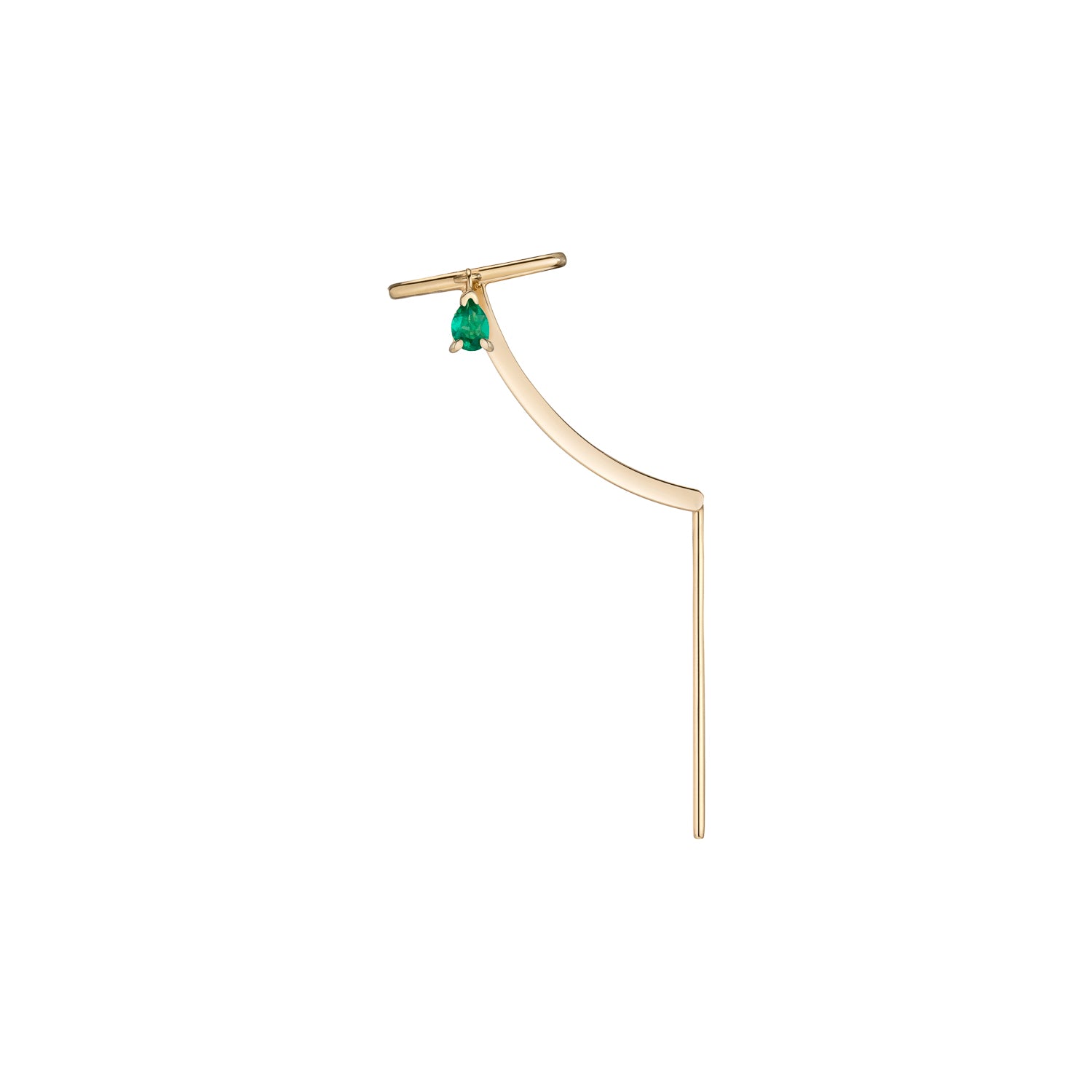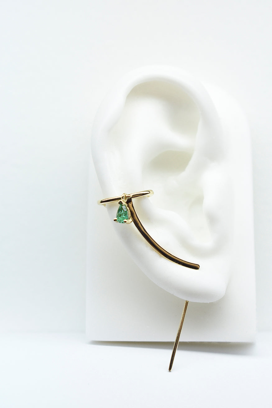 The Esmeralda Cuff Gold Needle Earring is a statement earring in solid 14k gold featuring a large emerald teardrop. It subtle design follows the outline of the ear finishing in a comfortable cuff with a teardrop dangle reflecting the light.