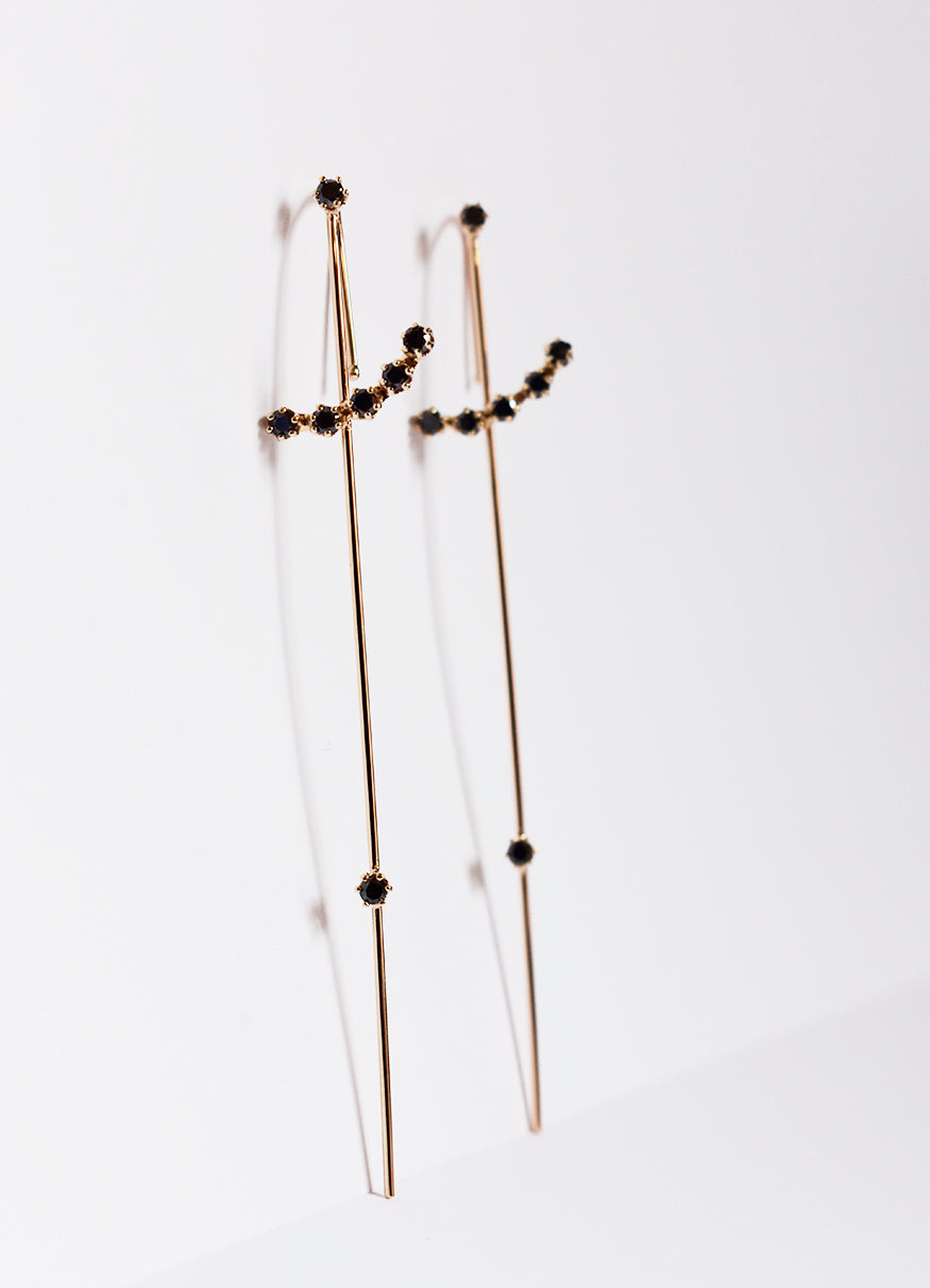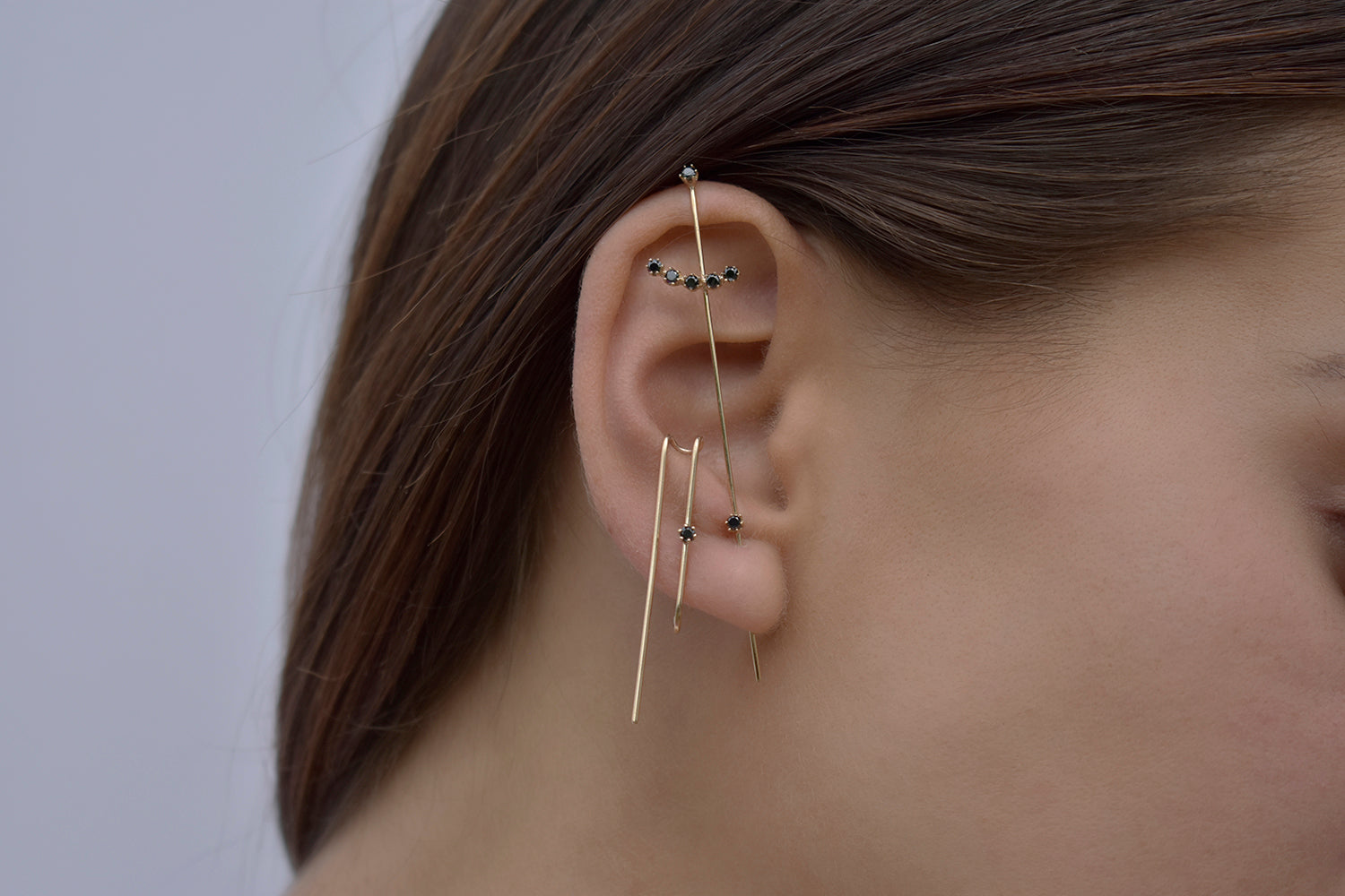 Thread the needle end through your ear lobe piercing and let the hook part cradle the top of your ear.
