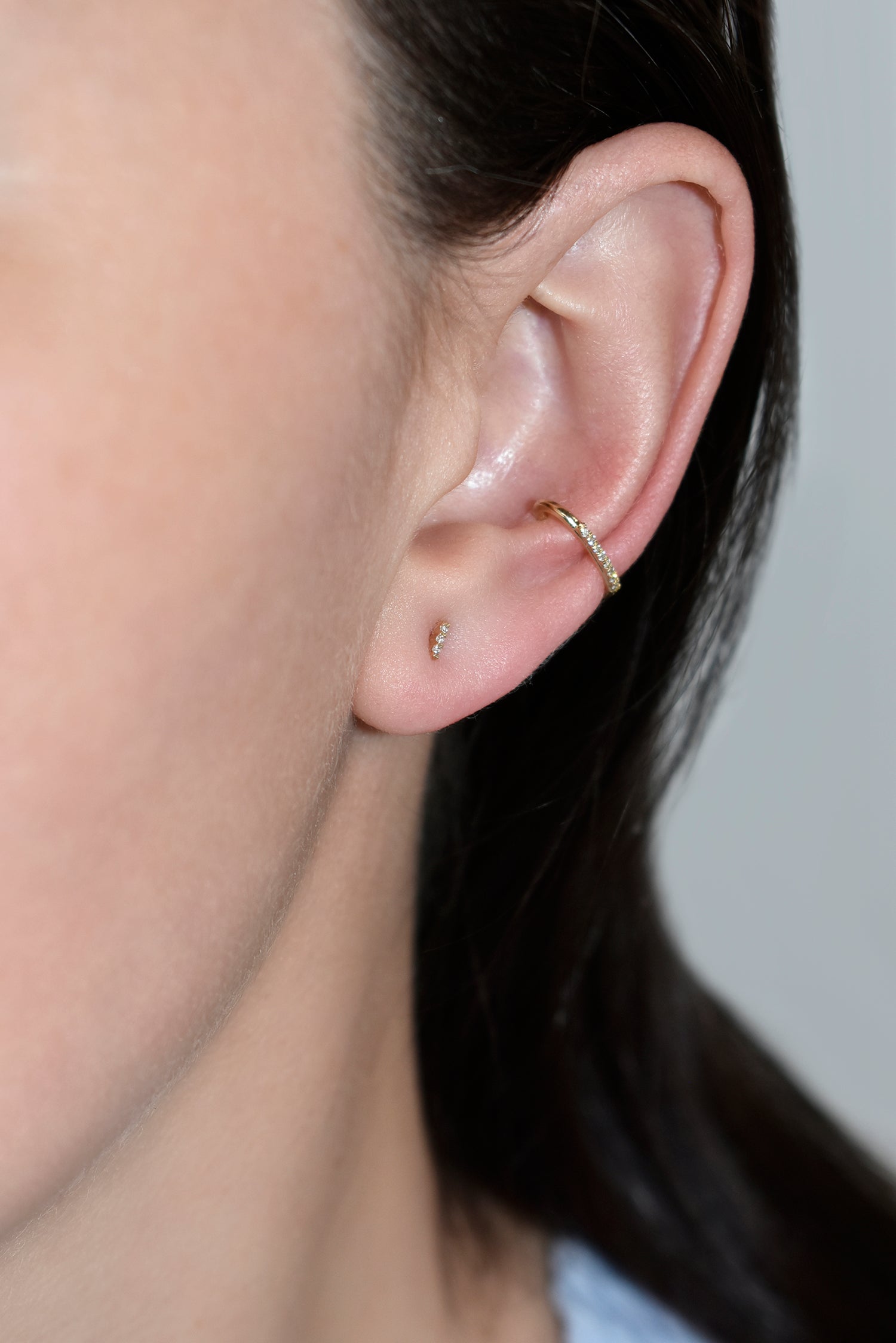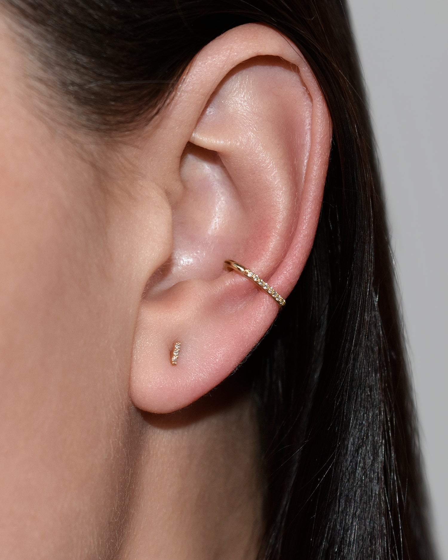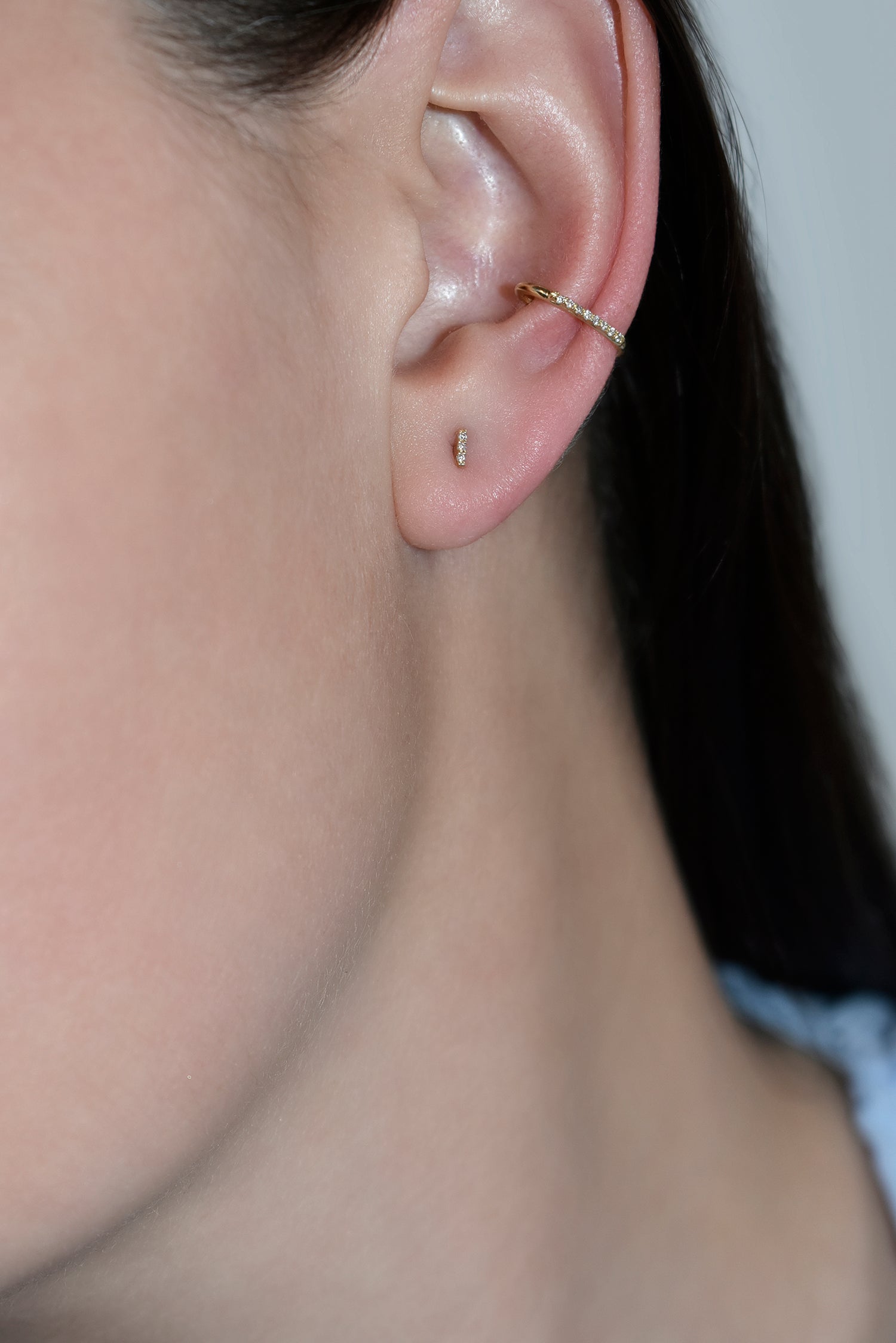 The Delicate Black Diamond Brick Stud Earring is an everyday stud earring set with three tiny black diamonds.