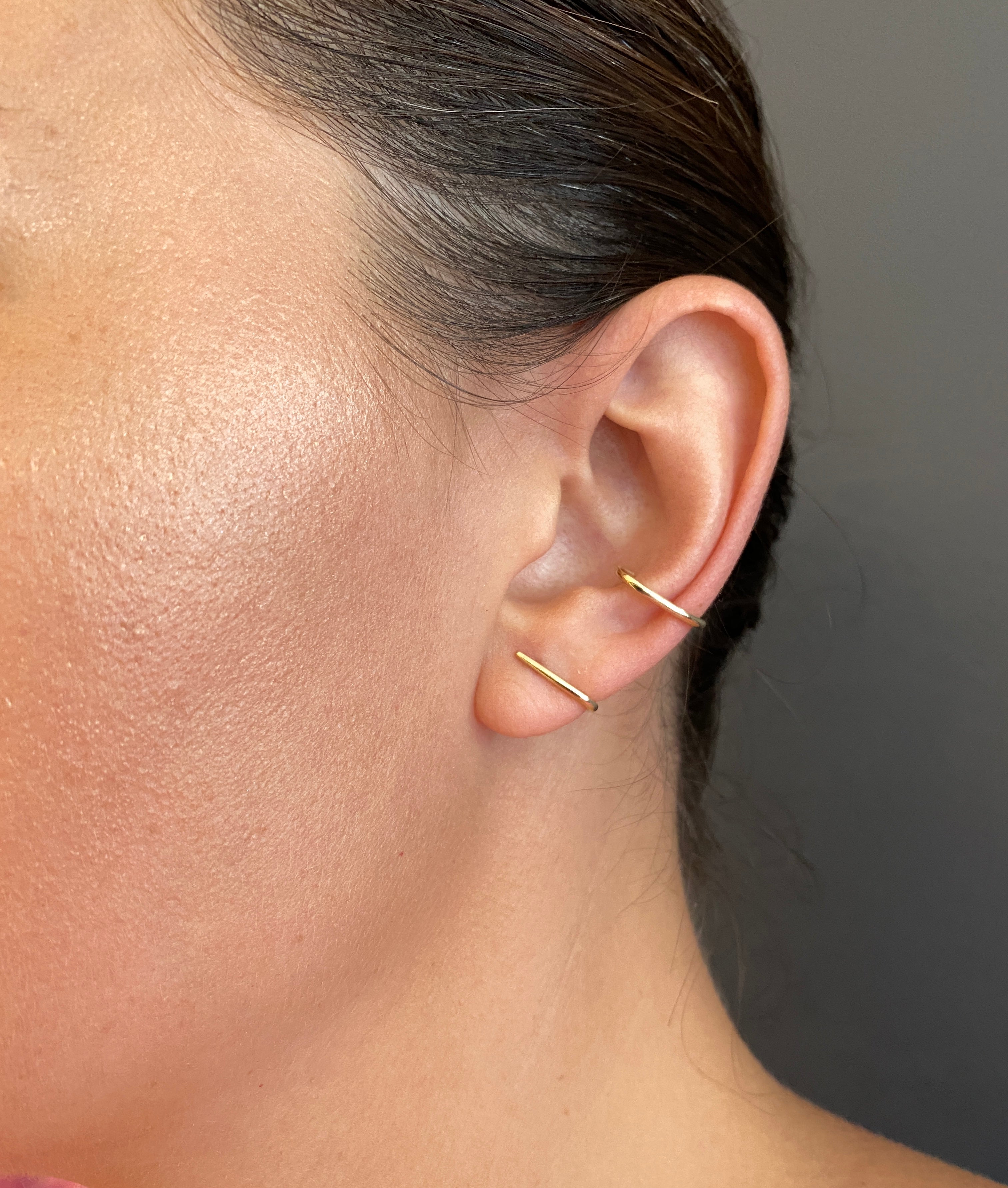 The Midi Crusader Ear Lobe Cuff Earring is a modern earring that hugs the bottom of the ear lobe. Wear it solo or paired with others to create a unique look.