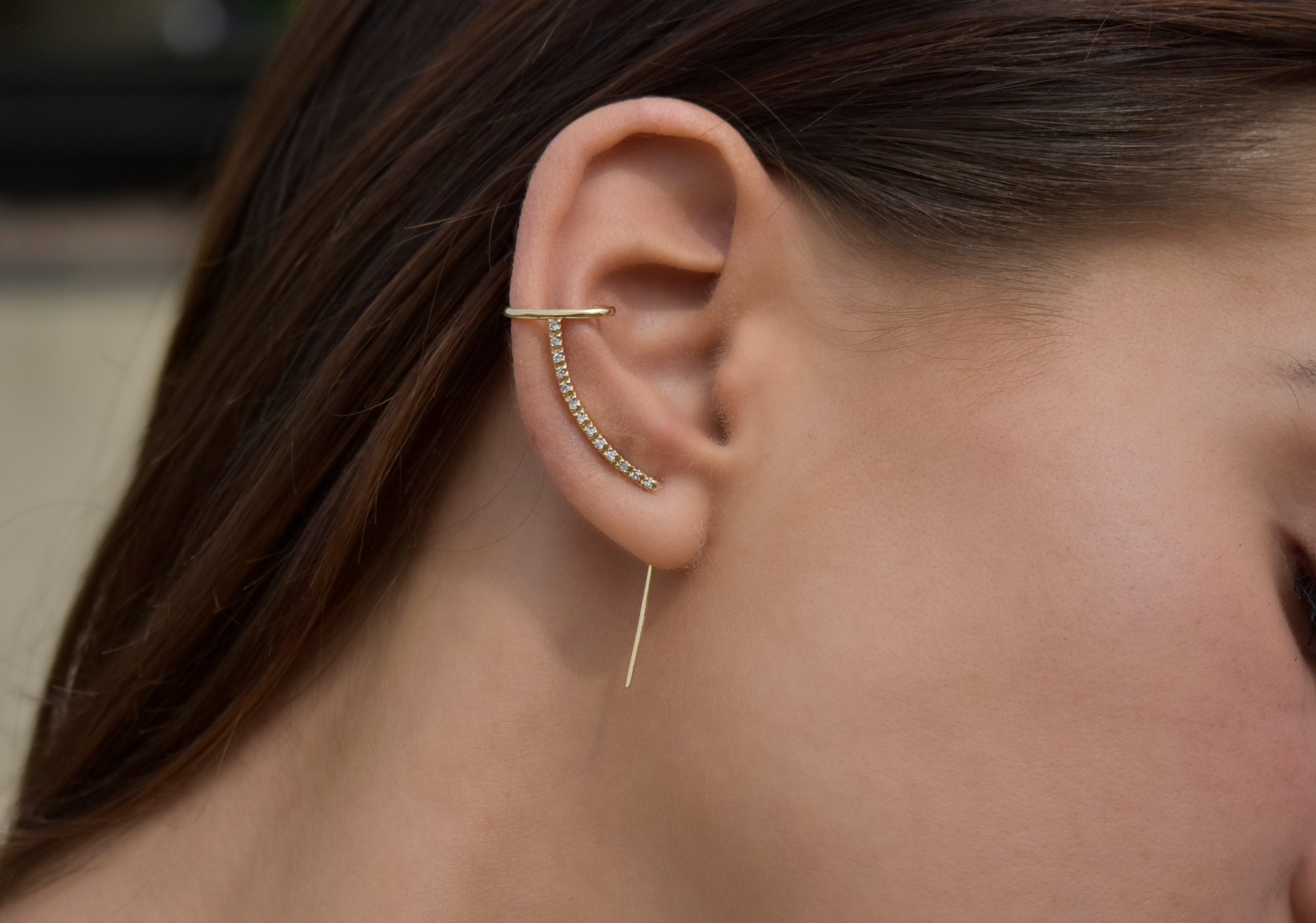 The Pave Diamond Cuff Needle Gold Earring is a statement earring in solid 14k gold featuring an arch of diamonds that reflect the soft sunlight. This style earring fallows the outline of the ear and ends with a comfortable cuff.