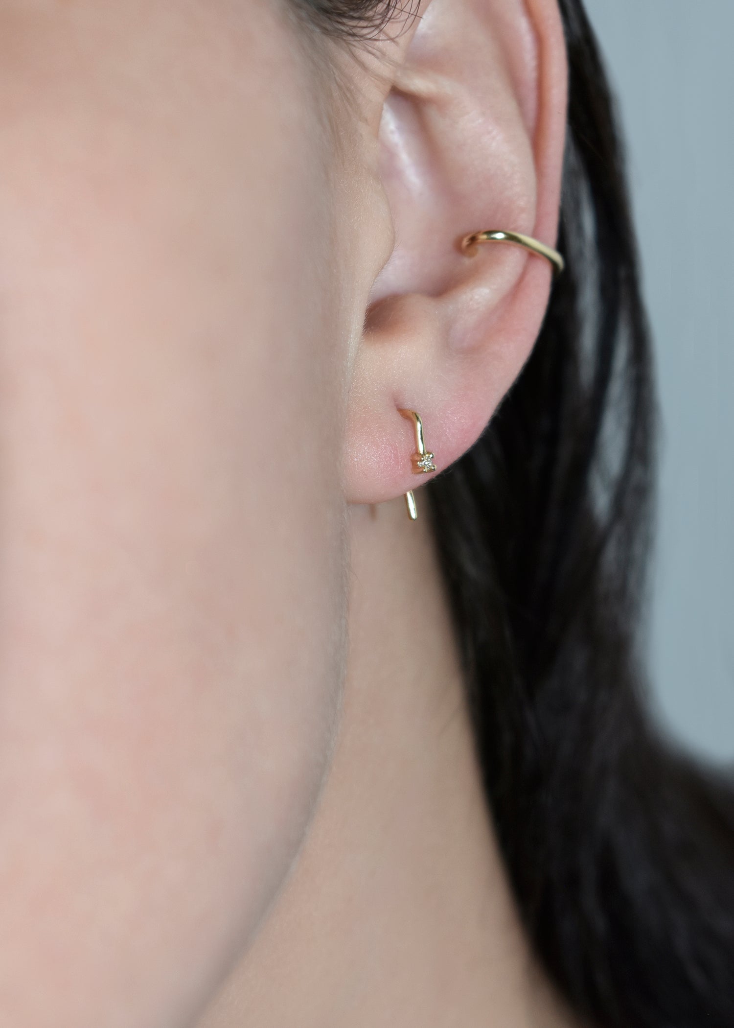 The White Diamond Tiny Gold Square Loop Hoop is a nonchalant earring easily worn threaded through the ear piercing. Effortless design that can be paired with others or worn solo.